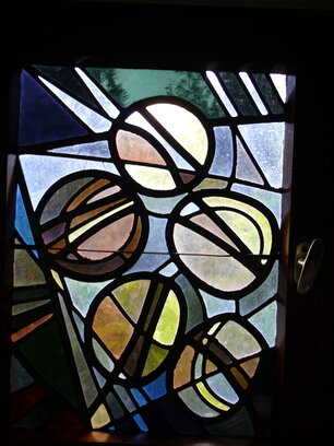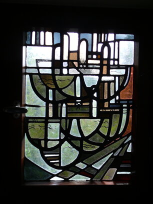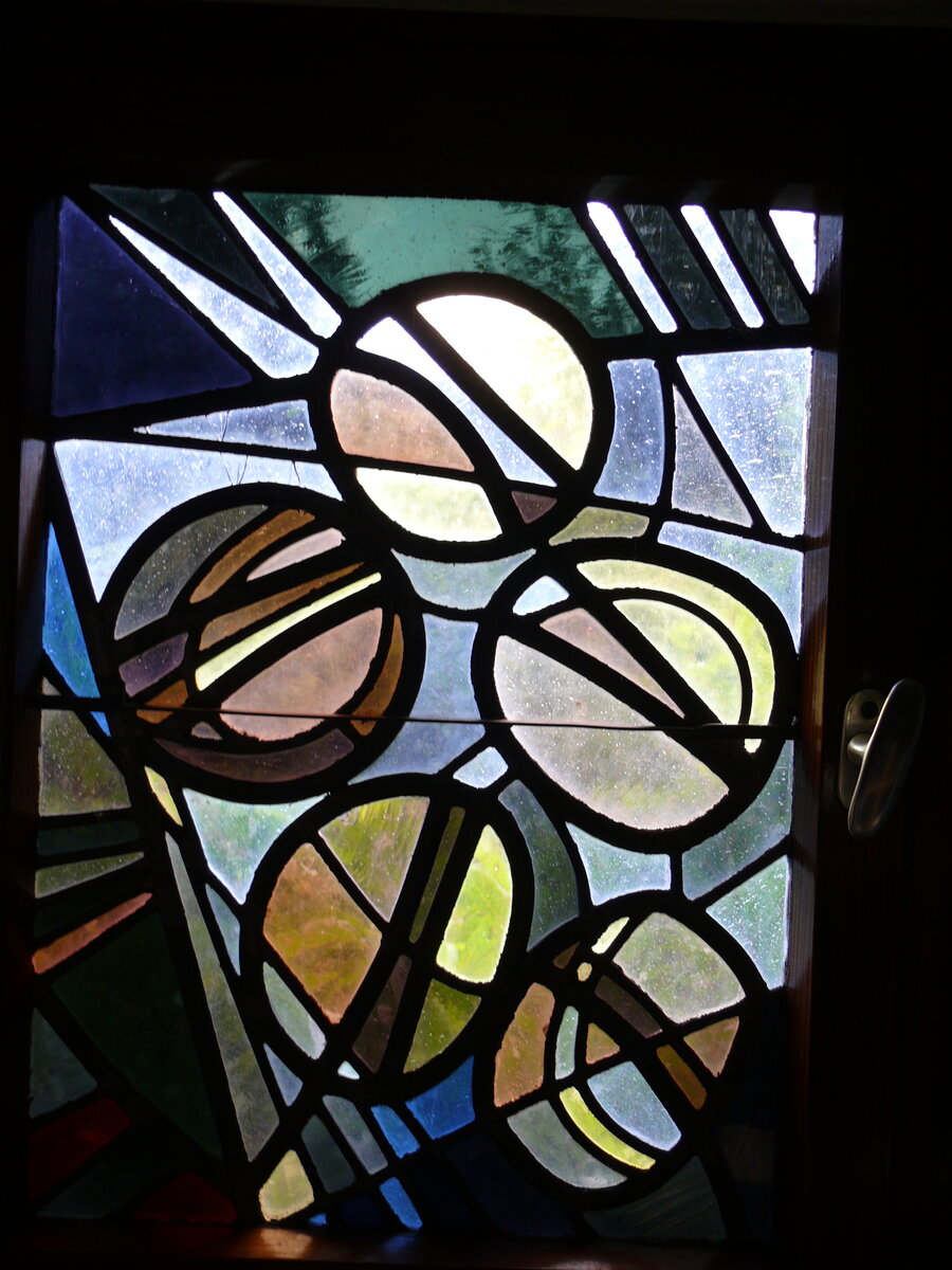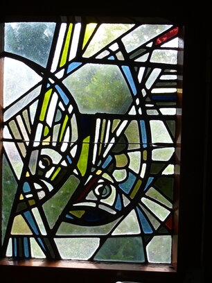 Die drei Fenster sind gestaltet zu den Speisungswundern Jesu: durch fünf Brote und zwei Fische werden 5000 Menschen satt.