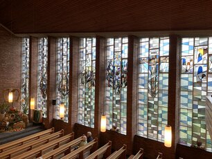 Die Fenster wurden 1963 von Fr. P. Scholz gestaltet (leider ist zur Zeit nicht klar, wer sich hinter diesem Kürzel verbirgt). Die Informationen können hier nachgelesen werden.