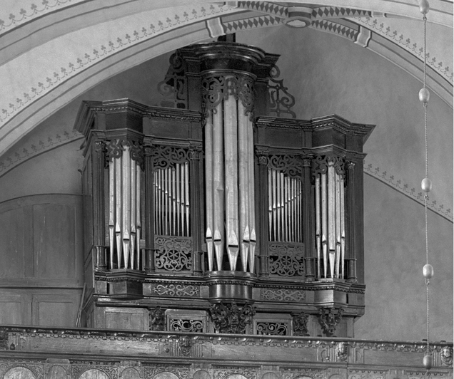 Älteste Fotografie der Orgel von Provinzialkonservator Albert Ludorff: Es fehlt der ornamentale Unterhang des südseitigen Spitzturms; mehrere Prospektpfeifen u. a. des Mittelturms sind sichtbar eingebeult (eine Folge des Emporenumbaus 1892?).